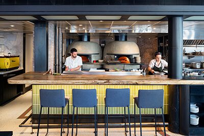 Richlite Black Diamond was used to make custom table tops with spalted maple edge detailing in NYC Italian restaurant Pasquale Jones. Interior design by Leroy Street Studio. The table tops were fabricated by Reliquary Studio.
